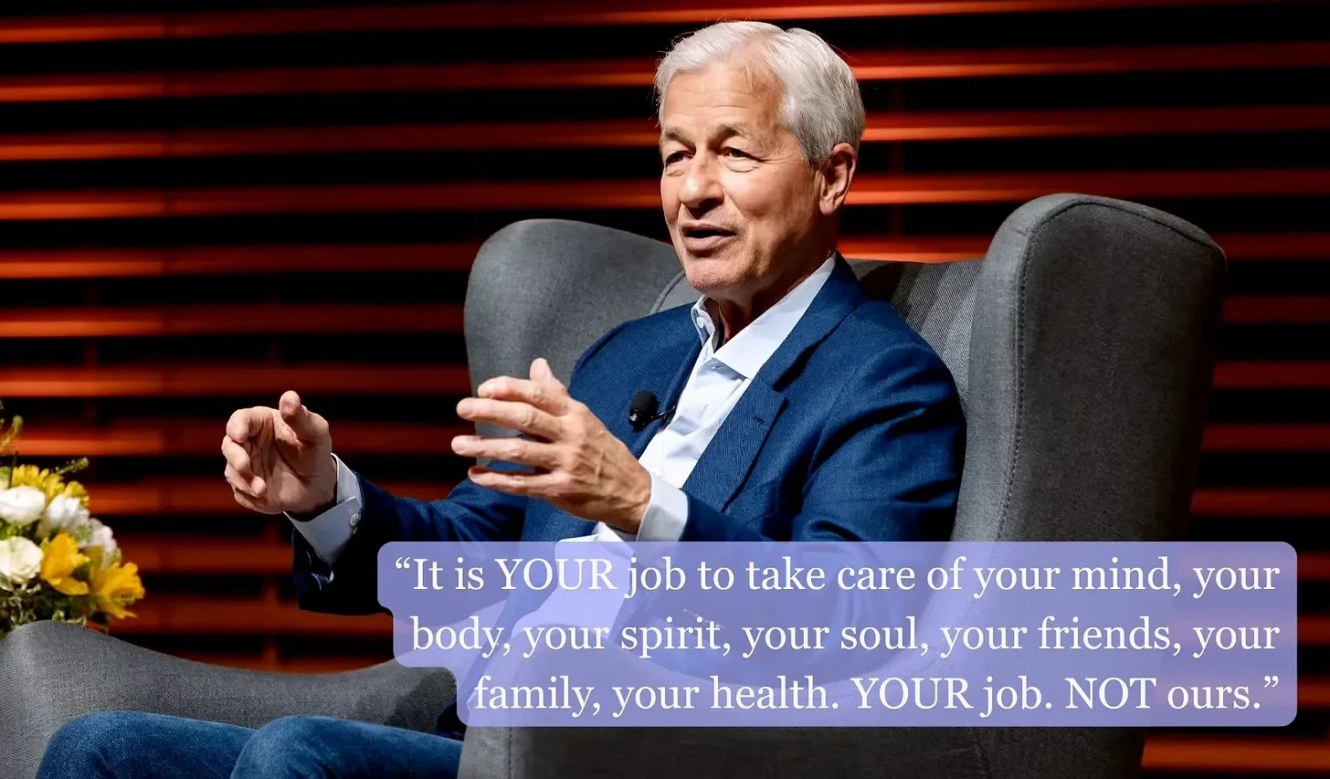 Profit-making enterprise does not have as its primary goal the wellbeing of the people it employs in the pursuit of that profit. Jamie Dimon, CEO of JPMorgan, said it best: “It is YOUR job to take care of your mind, your body, your spirit, your soul, your friends, your family, your health. YOUR job. NOT ours.”